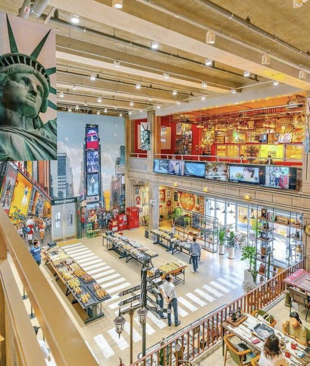 1층부터 4층까지 수백 명 이상 수용이 가능한 초대형 카페다. 다양한 맛집 소개 프로그램에 출연 경력이 있고 가수 정동원이 뮤직비디오 촬영장으로도 알려진 곳이다. 미국 뉴욕의 분위기가 묻어 나는 화려한 장식품과 포토존으로 가득하다. 벽에 걸린 뉴욕 타임스퀘어를 방불케 하는 큰 그림이 마주하고 있으면 뉴욕에 와 있는 듯한 착각이 들게 한다.