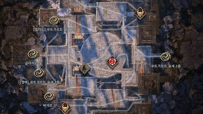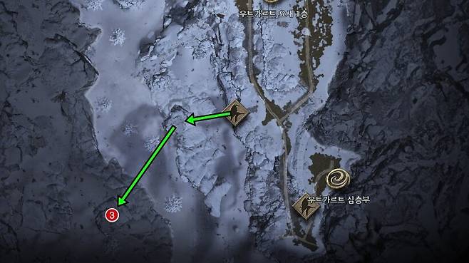 3. 우트가르트 요새 - 1층 도살자 모르다르 처치 글라시르 숲 - 에시르 산 정찰대의 절벽 주변 돌산 리프타를 활용해 이동 후 상자와 상호작용