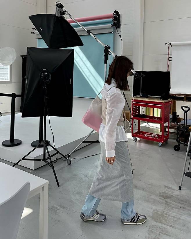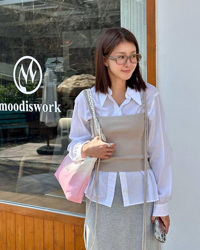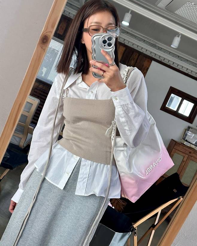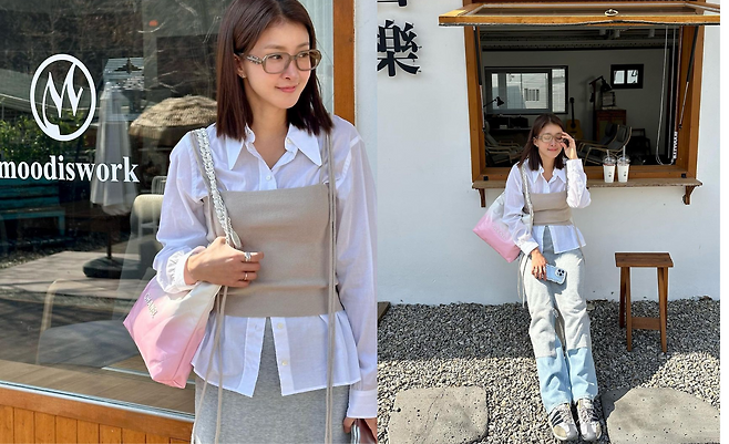 사진 속 이시영은 흰 셔츠에 아이보리 뷔스티에를 입고 그레이 치마와 청바지를 레이어드 해서 캐주얼한룩을 완성하였다.