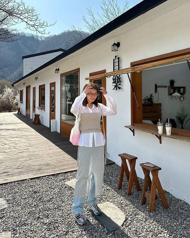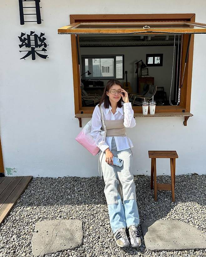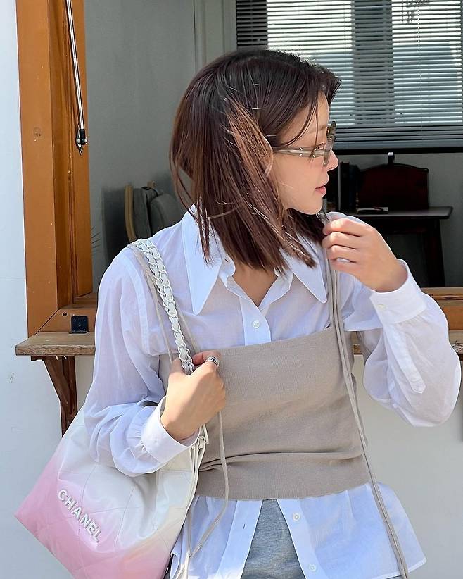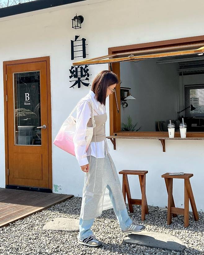 사진 속 이시영은 흰 셔츠에 아이보리 뷔스티에를 입고 그레이 치마와 청바지를 레이어드 해서 캐주얼한룩을 완성하였다.