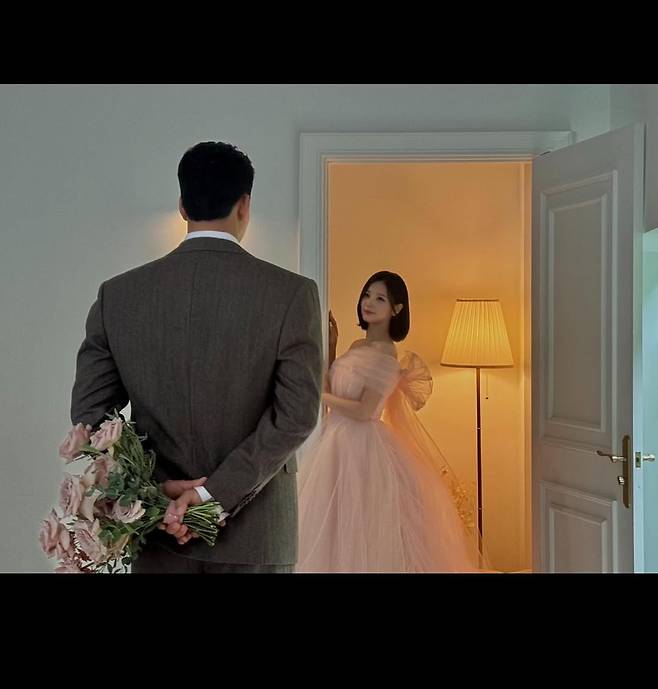분홍색 웨딩 드레스를 입고