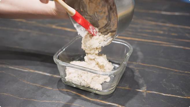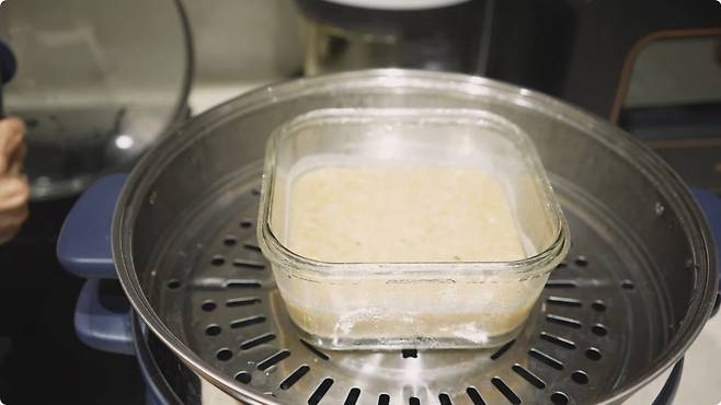 – 반죽을 유리 용기에 담아 찜기에 넣고 15~20분간 찐다.