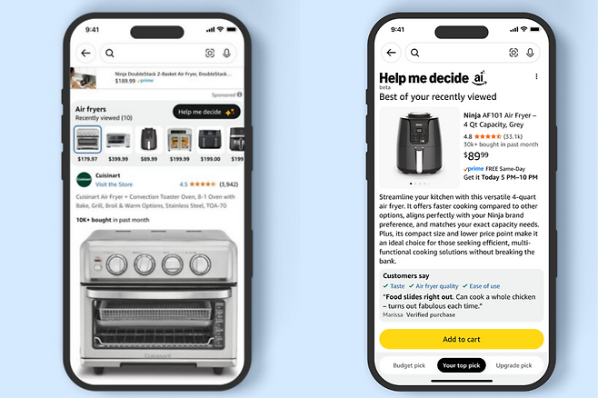 하지만 구매 결정 단계에서 선택의 폭이 넓다는 것이 오히려 고민거리가 된다는 이용자들도 존재한다. 아마존은 이러한 니즈를 반영해 비슷한 상품들 사이에서 빠르게 구매 결정을 내릴 수 있도록 돕는 AI 기능인 '헬프 미 디사이드'를 도입한다고 발표했다.