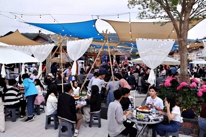 이처럼 활기찬 금요일에 시장을 방문하면 연탄으로 구운 불고기 외에도 바비큐, 떡볶이, 닭꼬치 등을 파는 푸드코트와 야외테라스에서 음식을 먹는 사람들이 즐비해있다.