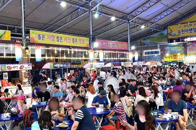 이처럼 활기찬 금요일에 시장을 방문하면 연탄으로 구운 불고기 외에도 바비큐, 떡볶이, 닭꼬치 등을 파는 푸드코트와 야외테라스에서 음식을 먹는 사람들이 즐비해있다.