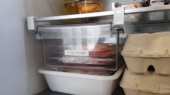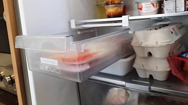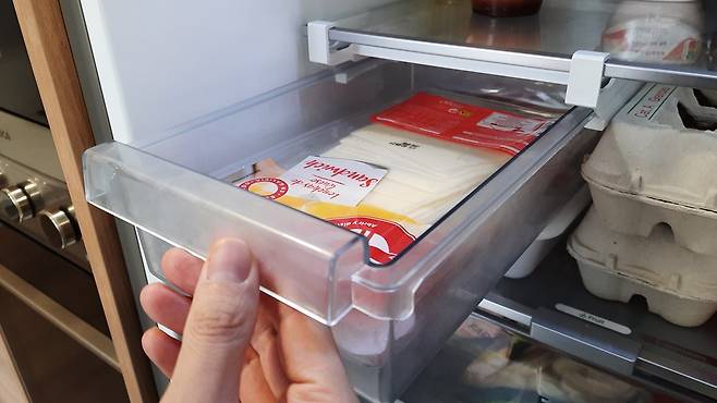 냉장고 정리함! 냉장고를 사용하다 보면 중간에 붕~ 뜨는 공간이 생기죠. 이런 공간을 잘 활용하면 치즈와 같이 얇은 제품을 수납해 놓지 딱 좋은데요.