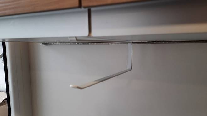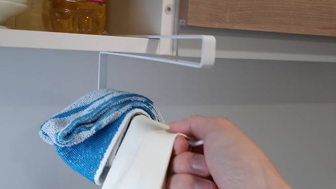 선반 걸이예요. 주방 상부장 아래에 못을 박지 않아도 손쉽게 설치할 수 있는 걸이인데요. 원래는 키친타월 용도이지만, 다른 용도로도 충분히 사용 가능하답니다.
