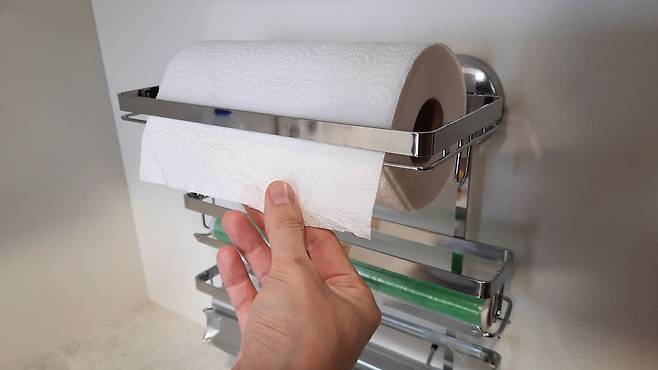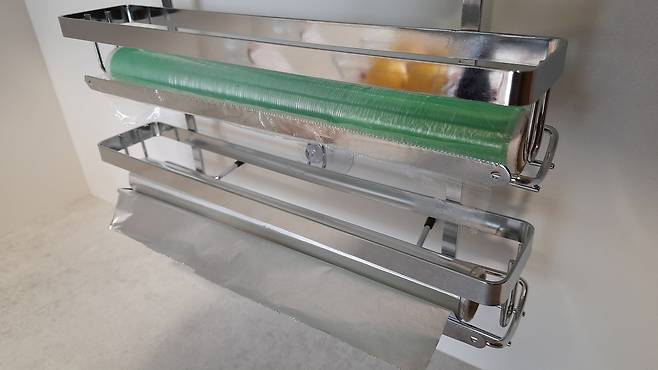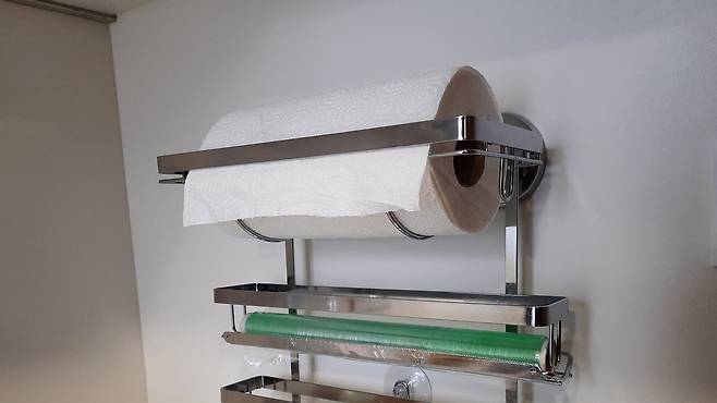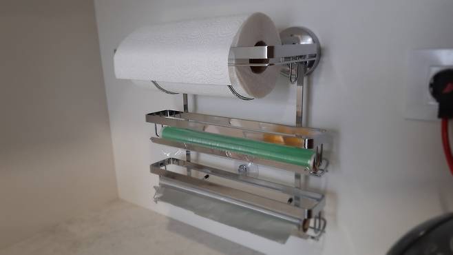 가장 큰 장점은 키친타월, 랩, 쿠킹포일등을 같은 공간에 보관할 수 있어 좋아요. 매번 요리할 때마다 필요한 것을 꺼냈다가 넣었다가 불편한데요. 이 제품이 있다면 동시에 보관할 수 있어 좋답니다.