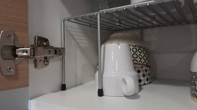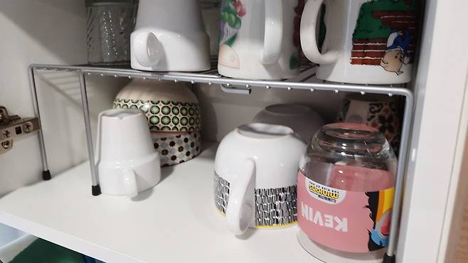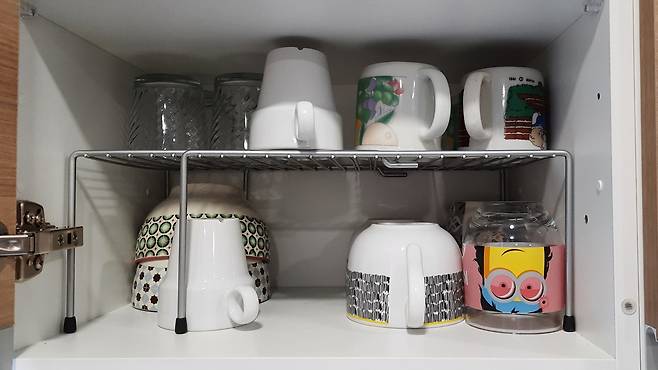 그냥 사용했다면 한 층에 모두 넣을 수 없었던 컵과 그릇들이. 분리가 되어 2층으로 모두 수납 가능도 하고요.