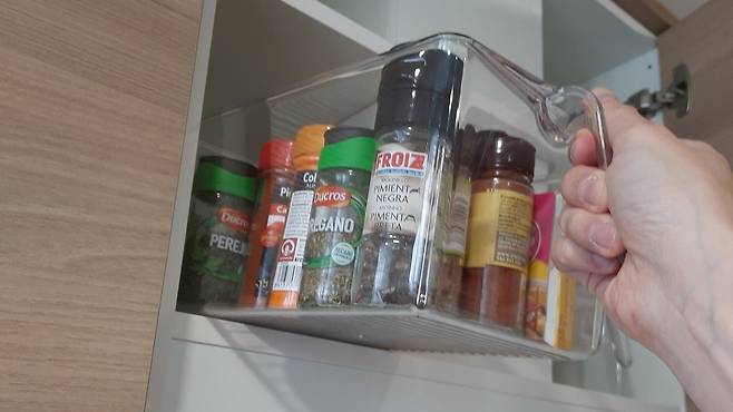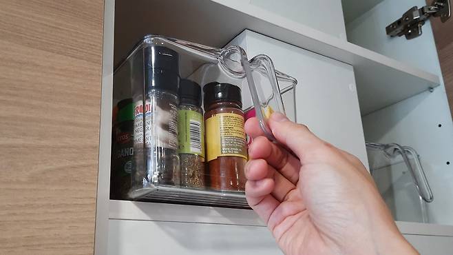 하지만! 요 제품이 있으면, 요렇게 손잡이를 쭉~ 잡아당겨 손쉽게 안에 있는 양념 재료까지 꺼낼 수 있다는 장점이 있답니다. 또, 투명제품으로 구매해 속 내부까지 쉽게 볼 수 있고요.