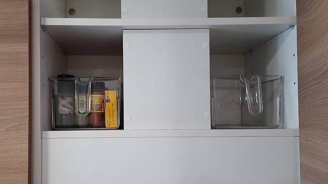 손잡이가 달린 보관함이에요. 저희 집 가스 후황 윗부분은 요렇게 되어 있어서 공간을 활용할 수 있는데요. 위치가 높아 선반 끝 부분에 있는 재료나 식기류 등은 보기가 어렵다는 단점이 있어요.