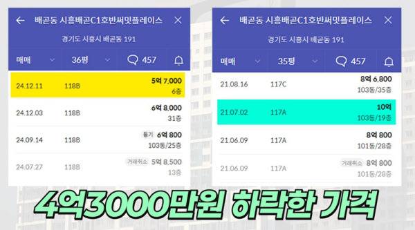 옆 단지인 시흥배곧C2호반써밋플레이스. 전용 84㎡가 지난달 6억원에 팔렸는데요. 직전 거래였던 6억3000만원 대비 3000만원 하락했습니다. 이 단지는 집값 상승기에 배곧 신도시에서 10억 클럽을 처음 달성했던 아파트이기도 한데요.