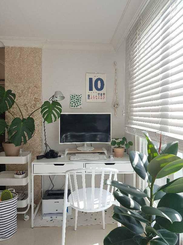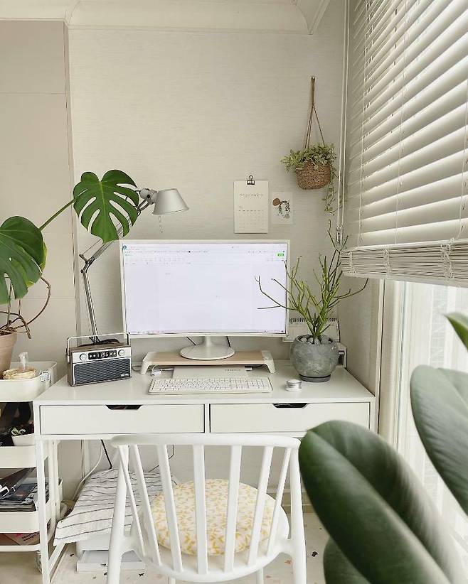화이트 책상과 푸른 식물들이 어우러져 더욱 시원해 보이는 공간이 완성되었어요. 이렇게 작은 공간이지만 조금씩 배치를 바꾸는 것만으로도 다양한 느낌을 주지 않나요? 비교적 쉽고 간편하게 내 취향을 담은 공간을 꾸밀 수 있는 데스크테리어, 여러분도 지금 바로 도전해 보시길 바랄게요.