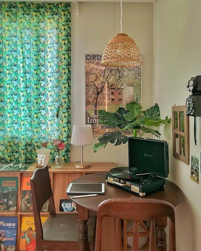 아이들 물건으로 꽉 찬 집이지만 엄마만의 소중한 공간이 있다면 얼마나 좋을까요? 아기방 한 켠에 짙은 우드 컬러의 테이블을 두고 꾸민 센스있는 공간입니다. 짙은 우드 컬러와 라탄 조명이 너무 잘 어울리죠? 두는 것만으로 인테리어 효과가 느껴지는 LP 플레이어까지. 사색을 즐기고 싶은 공간이네요.
