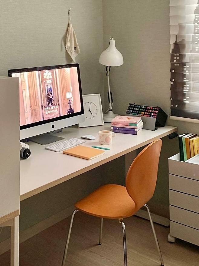 홈오피스의 장점은 무려 퇴근 1초컷이 가능한 데스크테리어는 화이트를 베이스로 아늑하면서도 깔끔하게 꾸민 것이 특징입니다. 오래 앉아 근무해야 하는 홈오피스 공간인만큼, 집중이 잘 될 수 있도록 꾸미셨다고 하네요.