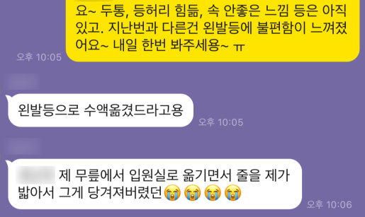 하루는 힐링 도중 지난번과 다르게 왼발등에 불편감이 느껴져 보호자님께 전했더니, 수액을 맞던 위치를 변경해서 그런 거라는 사실을 알게 되었습니다.