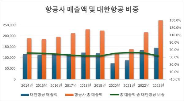 대한항공은 1969년 설립 이후 약 20년간 국제선, 국내선 항공 수요를 독점했던 국내 유일의 항공사였다. 이후 아시아나항공(1988년), 저비용항공사(LCC, 2004년)들이 등장하며 현재의 1강, 1중, 10약 체제가 만들어졌다.