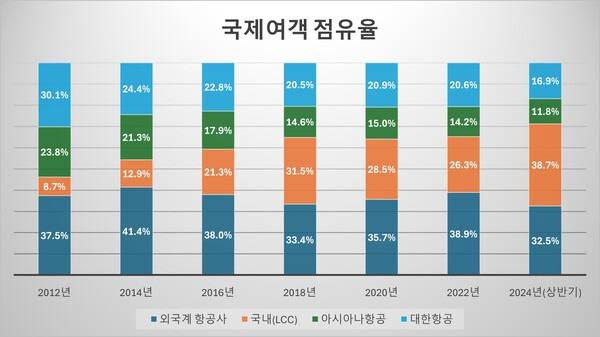 빈자리는 LCC가 채웠다. 2014년 12.9%로 점유율을 늘렸고, 코로나19 팬데믹 직전인 2019년에는 31.7%으로 규모를 키웠다. 팬데믹 종료 후 항공 수요가 회복되자 올해 상반기에는 38.7%의 점유율을 기록했다.