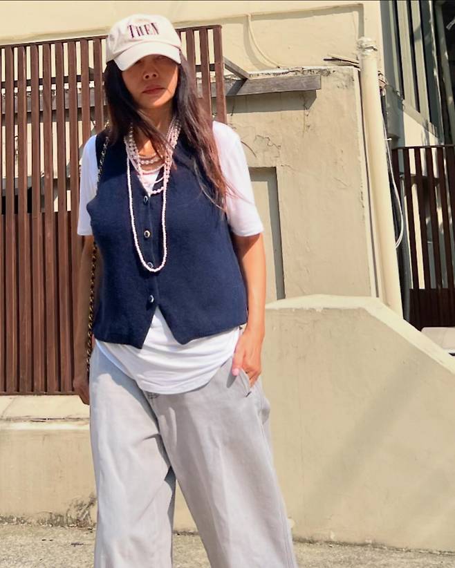 사진 속 황신혜는 니트베스트에 진주목걸이를 매치해 언발란스한 패션을 선보였습니다.