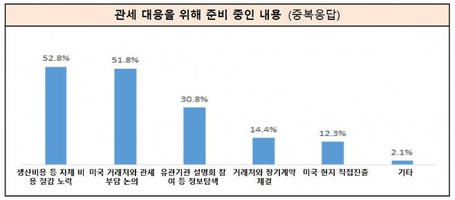 또한, 응답 기업 중 32.5%만이 미국 관세 대응을 준비하고 있는 것으로 나타났다. 이들이 대응안으로 준비하는 내용은 ▲생산비용 등 자체비용 절감 노력(52.8%), ▲미국 거래처와 관세 부담 논의(51.8%), ▲유관기관 설명회 참여 등 정보탐색(30.8%), ▲거래처와 장기계약 체(14.4%), ▲미국 현지 직접 진출 (12.3%) 순으로 나타났다.