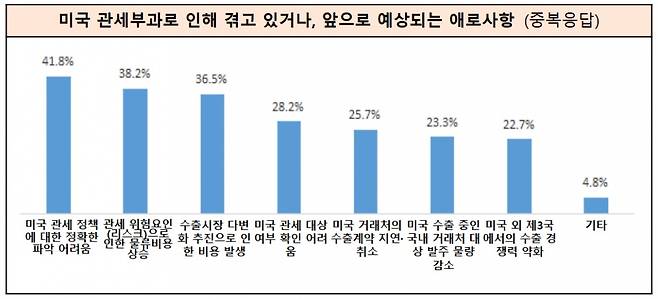 이번 조사에서 기업들은 가장 큰 애로사항으로 ‘미국 관세정책에 대한 정확한 파악 어려움’(41.8%/중복응답)을 꼽았다. 그 뒤를 ▲관세 위험요인(리스크)으로 인한 물류비용 상승 (38.2%), ▲수출국 다변화 비용 발생(36.5%), ▲미국 관세 대상 여부 확인 어려움(28.2%) ▲미국 거래처의 수출계약 지연·취소로 인한 경영애로(25.7%), ▲미국 수출 중인 국내 거래처 대상 발주 물량 감소(23.3%), ▲미국 외 제3국에서의 수출 경쟁력 악화(22.7%) 순으로 응답했다. 응답 1위와 3위가 관세 정보가 부족하다는 의미를 담고 있어 관련 업계에 정확하고 신속한 정보 제공이 필요한 것으로 확인됐다.
