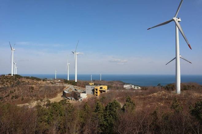 동해 바다와 맞닿은 언덕 위에 자리 잡아 바다와 풍력발전기가 만들어내는 이질적인 조화가 독특한 경관을 만들어냅니다.