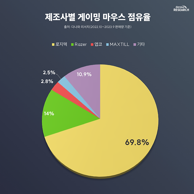 지난 1년간 다나와에서 판매 집계된 '제조사별 게이밍 마우스 점유율'을 살펴보자. 1위는 로지텍이다. 69.8%이라는 과반수의 점유율로 2위인 레이저(14%)와도 차이를 많이 벌렸다.