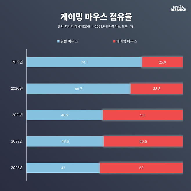 게이밍 마우스 점유율은 2019년 25.9%에서 시작해 2021년 51.1%로 50%를 넘겼다. 현 2023년 시점에는 53%로 확인되며 일반 마우스와 시장을 양분하고 있다. 왜 이렇게 빠르게 점유율이 상승하게 됐을까?