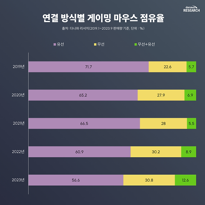 연결 방식별 게이밍 마우스 점유율을 보자. 2019년 기준으로는 유선 방식이 74.1%에 무선 방식은 25.9%였지만, 2023년에는 유선 방식이 47%에 무선 방식이 53%로 역전됐다. 이 점은 2021년부터 이어지고 있다.