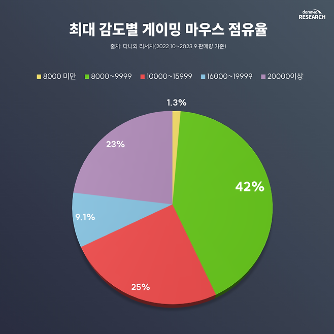 최대 감도별 게이밍 마우스 점유율은 8000~8999 구간이 1위다. 최대 감도가 높은 마우스가 보통 비싼 편인데, 사실은 최대 감도가 높다고 무조건 좋은 것은 아니다. DP가 높으면서 배율을 세부적으로 조절할 수 있어야 좋은 마우스라 볼 수 있다.