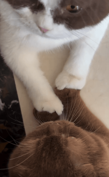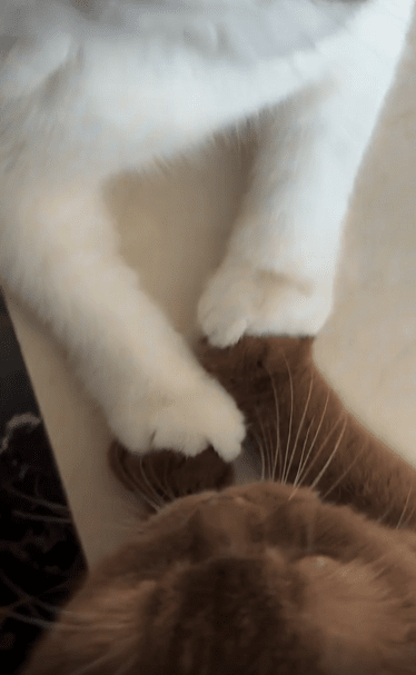흰 고양이는 조금 더 경계심이 적은 듯 살짝 몸을 내민 채 앞발을 내밀었고, 커피색 고양이는 느긋하면서도 안정된 자세로 그 앞발을 받아주었습니다. 겉으로 드러나는 감정은 없지만, 그 안엔 말보다 더 큰 교감이 녹아 있습니다. 소리를 내지 않아도 서로를 이해할 수 있는 존재, 그게 바로 이 둘이 아닐까요?