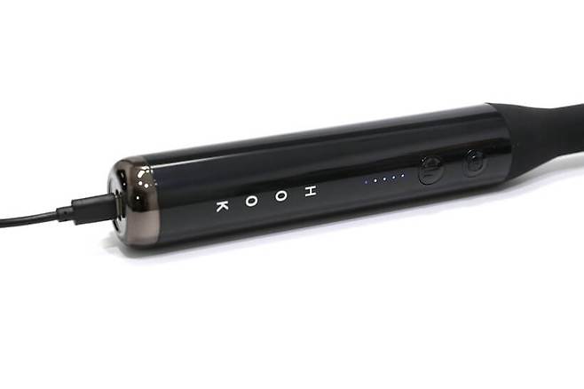 손잡이 끝부분에도 머리 부분 끝처럼 메탈릭한 브라운 컬러가 적용되어 있으며, 가운데 부분에는 충전용 USB 포트가 자리 잡고 있다. 포트 규격은 USB C타입으로, 스마트폰 충전 케이블과 호환 가능하다.