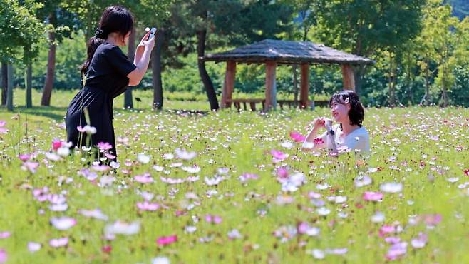 한여름 장마가 본격적으로 시작된 지난 23일 충북 괴산군 농업기술센터 주변에 이색적인 여름 풍경이 펼쳐졌다. 흐린 날씨 속에서도 화사하게 피어난 ‘살살이꽃’이 방문객들에게 특별한 볼거리를 제공하고 있는 것이다.