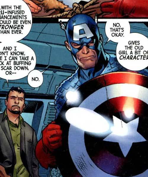 그래서 이후로 똑같은 방패를 만들고 싶어도 뭐가 들어갔는지 몰라 만들 수가 없는 실정이다. 제2차 세계대전 동안에 무기화를 위해 만들어낸 이 방패는 프랭클린 루스벨트 미국 대통령이 직접 캡틴 아메리카에게 수여했다.