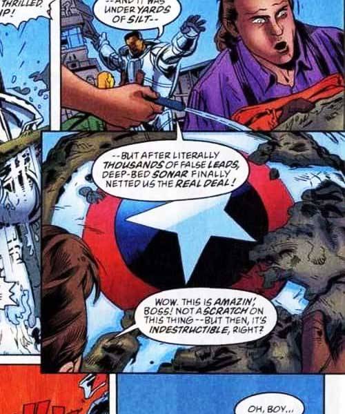 대서양에 방패를 빠뜨린 일도 있었는데, 토니 스타크가 사람을 시켜 바닥까지 훑은 덕분에 찾아낼 수 있었다. 그런데 방패가 그동안 흡수한 에너지들로 인해 정체불명의 성분의 분자 구조가 변해있었고, 이로 인해 갑작스럽게 깨지고 말았다.