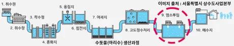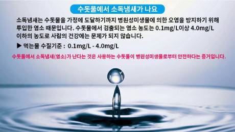 최초 정화 과정에서도 염소가 투입되지만, 급수관을 통해 물이 이동하면서 재오염의 가능성도 있기 때문에 중간 지역 곳곳에서 염소를 투입하기도 합니다. 그래서 최종 공급 전 염소 함유량이 0.1~0.2ppm 이상이 되도록 관리하는 것이 우리나라 수돗물 입니다.