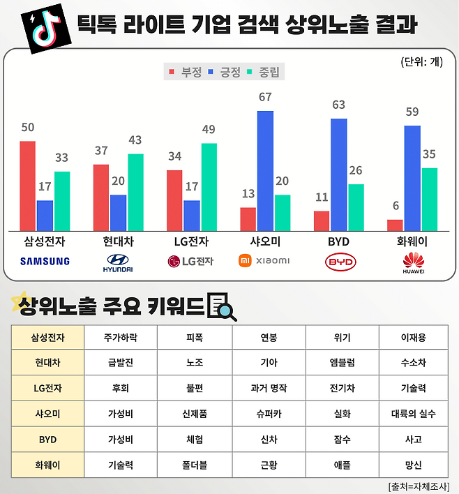 틱톡 라이트에서 기업별 검색 콘텐츠를 분석한 결과, 국내 기업 관련 콘텐츠의 절반가량이 부정적인 반면, 중국 기업 관련 콘텐츠는 긍정적인 영상이 압도적으로 많았다. 특히 삼성전자의 경우, 100개 콘텐츠 중 절반인 50개 이상이 부정적인 분위기를 풍기고 있었으며, 긍정적인 콘텐츠는 고작 17개에 불과했다. 현대차와 LG전자 역시 부정적인 영상이 긍정적인 영상보다 약 2배 많았다.