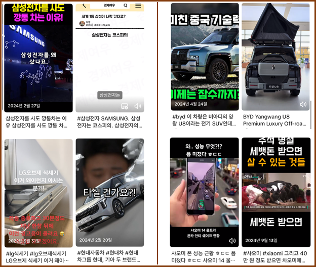반면, 중국 기업들은 압도적으로 긍정적인 콘텐츠가 노출되고 있었다. 중국 기업 관련 콘텐츠의 대부분이 △가성비 △기술력 △신제품 △근황 등의 키워드로 채워져 있었다. 이는 최근 글로벌 시장에서 입지를 넓히고 있는 중국 기업들의 경쟁력을 강조하기 위한 콘텐츠들로 보인다. 또한, 샤오미의 슈퍼카, 화웨이 폴더블 폰 등 기술력과 프리미엄 제품을 강조하는 영상도 쉽게 찾아볼 수 있었다.
