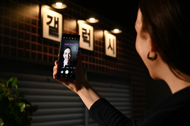 갤럭시S23 시리즈의 모든 제품은 전면 카메라 1,200만 화소를 지원합니다. 삼성은 ‘나이토그래피’라는 이름으로 저조도 촬영 성능을 굉장히 강조했는데요, 실제로 빛이 거의 들어오지 않는 어두운 부스 안에서 촬영해보니 전면 카메라로도 굉장히 밝은 인물 사진이 찍히는 것을 확인할 수 있었습니다. 전면카메라 인물 촬영시 AI가 얼굴의 각 부분을 인식해 머리카락이나 눈썹, 눈동자, 입술 같은 디테일은 더 선명하게 표현해주고, 피부 표현은 부드럽게 처리해줍니다.