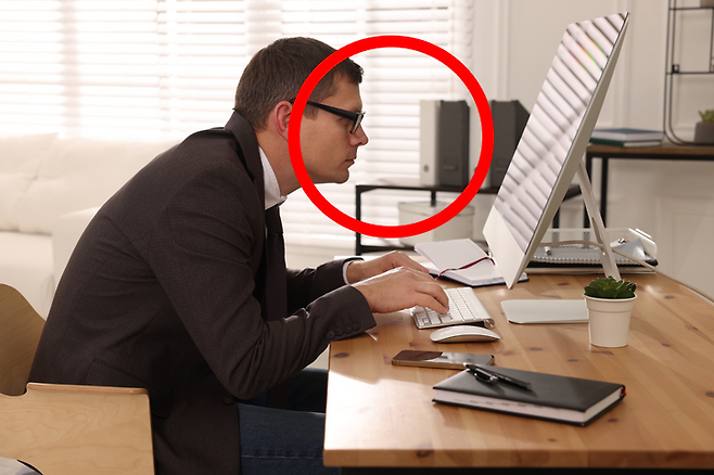 모니터 위치가 눈의 위치보다 낮을 경우, 목이 앞으로 이동하기 쉬운데요. 이로 인해 목과 어깨의 긴장이 발생하면 두통과 목 디스크로도 이어질 수 있습니다. 따라서 모니터가 너무 가까이 위치하거나 눈보다 아래에 위치하지 않도록 하는 것이 좋은데요. 시선은 좌골을 잘 눌러앉아 허리가 긴장되지 않은 상태에서 어깨와 팔을 편하게 놓고, 약간 올려다볼 수 있으면 좋습니다. 모니터를 올려다볼 수 있도록 모니터의 위치를 조정해 보세요!