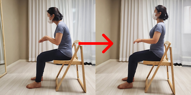 의자에 앉을 때 좌골에 집중해서 앉아 주세요. 좌골이란 손바닥을 펴서 한쪽 엉덩이를 든 채 엉덩이 아래 손바닥을 놓고 엉덩이를 내렸을 때 손바닥에 느껴지는 뼈입니다. 좌골이 의자 바닥에 닿는지를 확인해 주세요. 좌, 우 좌골이 의자에 잘 눌려있는지 확인했을 때 잘 눌린 채 앉았다면 바른 자세입니다.