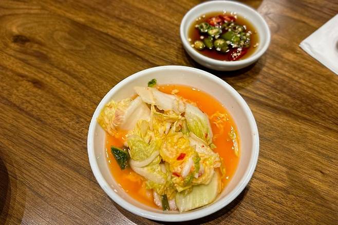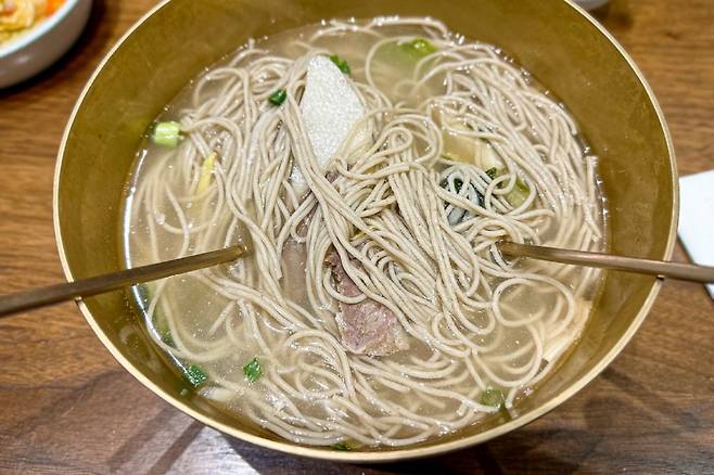 이렇게 먹으면 최선이라고 하는데, 처음 가면 무조건 따라 해보길 권한다. 육수는 처음에 먹으면 다른 평양냉면 육수보다 조금 간간한 느낌이 있다. 염도가 다른 곳에 비해 살짝 있는 편인데 면을 풀거나 식초가 들어가면 그다지 간간한 느낌은 없다.