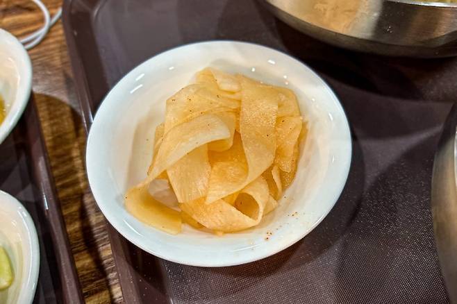 반찬도 무김치 한 종류. 테이블에 내려놓고, 살펴보니 서민적인 느낌이 물씬 풍긴다. 언제부터인지 평양냉면은 비싸다는 불만이 많았다. 물론 공들여 만드니 어쩔 수는 없다 치더라도 올라도 사실 너무 많이 오른 것은 사실 아닌가? 한 끼 식사 1만 원에도 손이 떨리는 서민 처지를 생각해보면 평양냉면은 이제는 서민 음식이라고 하기는 어려울지도 모르겠다.