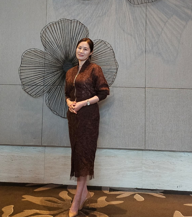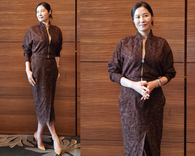 문소리는브라운 원피스를 입고 우아한 분위기를 발산했습니다. 퍼프 소매가 특징인 이 슬림한 원피스는 문소리의 세련되고 여성스러운 매력을 잘 살렸습니다. 원피스의 색감은 그녀의 피부톤을 더욱 돋보이게 했으며, 간결하면서도 고급스러운 느낌을 주었습니다. 신발은 베이지 구두를 매치하여 전체적인 룩에 따뜻하고 세련된 느낌을 더했죠.