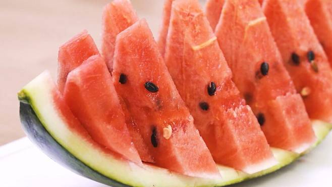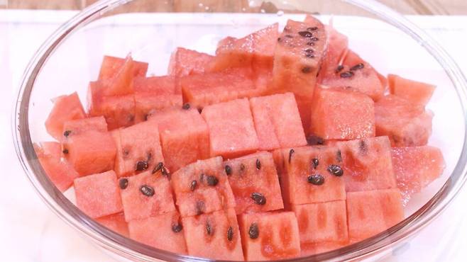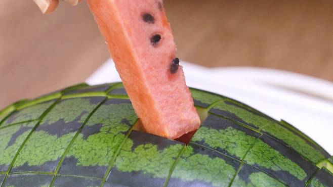 이렇게 자른 수박은 접시 위에 놓고 수박바처럼 하나씩 빼서 먹기 좋습니다. 남은 과육은 깍둑썰기를 한 후 밀폐 용기에 보관하면 나중에 하나씩 먹기에도 좋습니다.