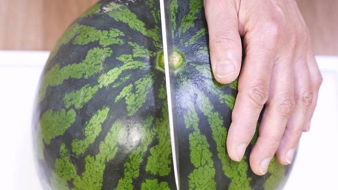 수박 물기를 깨끗이 닦은 후 도마에 올리세요. 그리고 수박 꼭지 중심으로 절반을 갈라 줍니다.