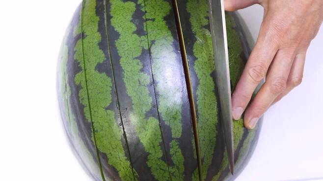 반으로 자른 수박에서 다시 반으로 자른 수박을 준비하세요. 그리고 옆 부분을 칼로 깊숙이 잘라 줍니다. 두 번 정도 칼집을 내어 주면 적당합니다.