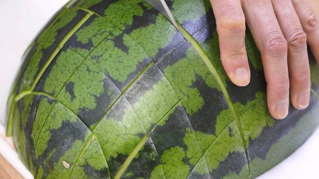 수박을 반대로 돌려 다시 같은 방법으로 손가락 2마디 길이로 잘라 줍니다.