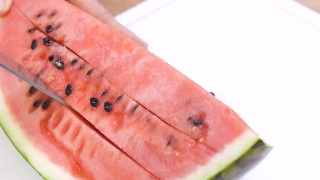 이후 손가락 2마디 정도 길이 정도로 수박을 잘라 주세요. 가장자리 부분은 흰 과육 부분이기 때문에 짧게 자르는 것이 먹기 좋습니다.