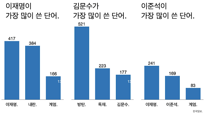 - 한국일보가 유세 연설문을 분석했는데 이재명은 ‘내란’과 ‘계엄’을 각각 384번과 166번 썼다. 김문수는 ‘방탄’과 ‘독재’를 521번과 223번 썼다.